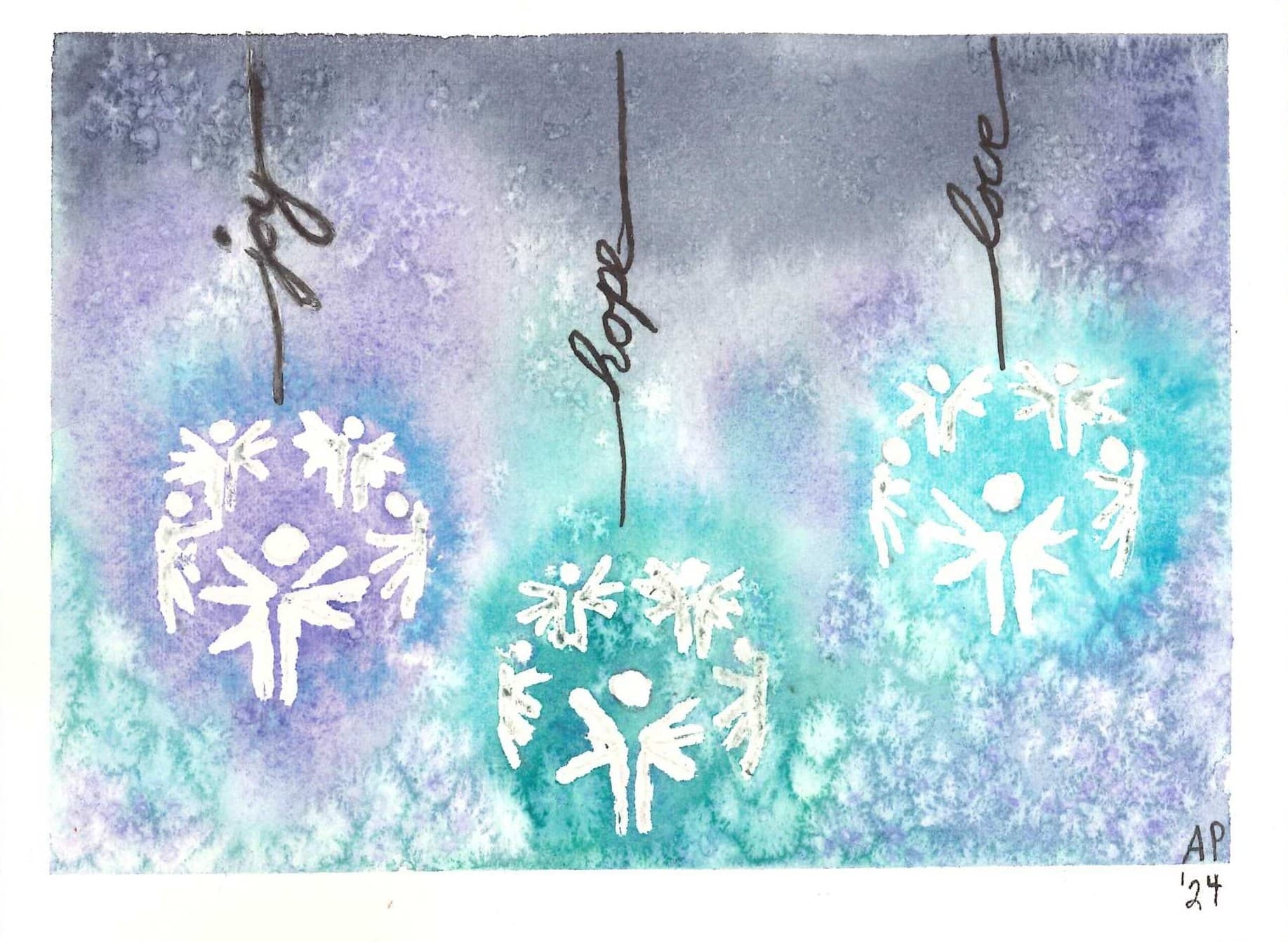 When designing her holiday card, Allie shared that she was inspired by the official Special Olympics logo and hoped to incorporate that symbol into her holiday card design. She also used watercolor to create the vibrant background and mixed salt with the water and paint to create an authentic snow texture in her design.